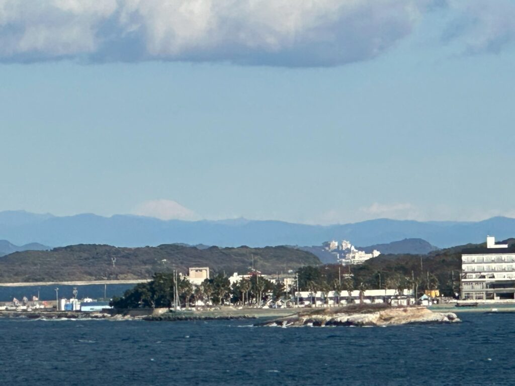 キラキラ輝く海と山の向こうに冠雪した富士山を拝むことができました