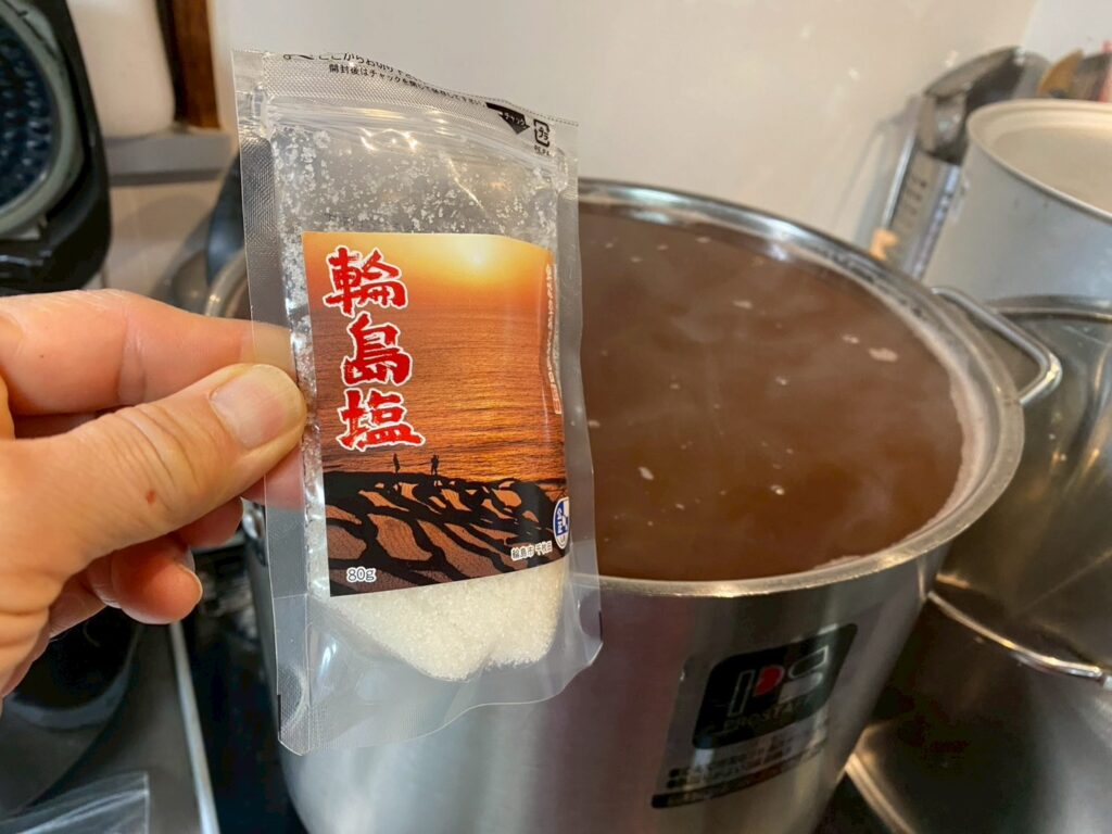 北海道産大納言小豆をたき輪島の塩沖縄県の塩で味付けた店長(家田製菓社長)手づくりのぜんざい。