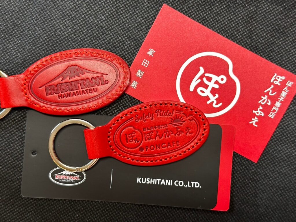 オリジナルデザイン、牛革製の両面(クシタニ&ぽんかふぇ柄)キーホルダーです。