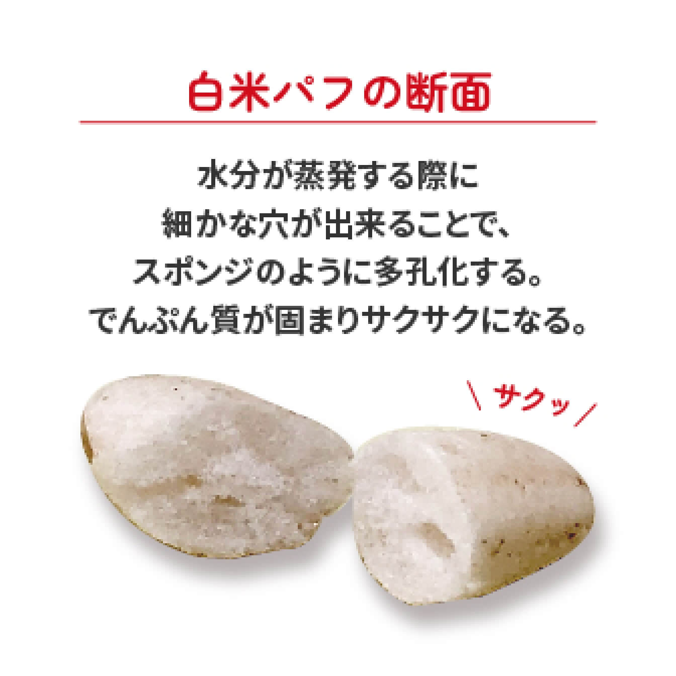 米などの穀物に圧力をかけた後に一気に開放することによって膨らませた「膨化食品」です。